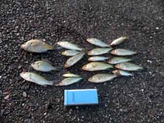 | 橋冨さん | 守山市湖岸 | ブルーギル | 21尾/ 1.8kg | ミミズ | 天候 | 晴 | 湖産エビが調達できず、ミミズで対応。 延べ竿によるウキ釣り。 ハスが釣れる。 |