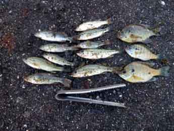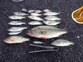 天候 | 晴 | 前日とうって変わって風もなく湖面も穏やかだったが、ミミズにはほとんど反応なし。 オオクチバスの大半がルアーによるもの。 ルアーは47mmで夜光仕様。 延べ竿によるウキ釣り(エサ:ミミズ)で釣ったものはブルーギル8匹、オオクチバス6匹。 |